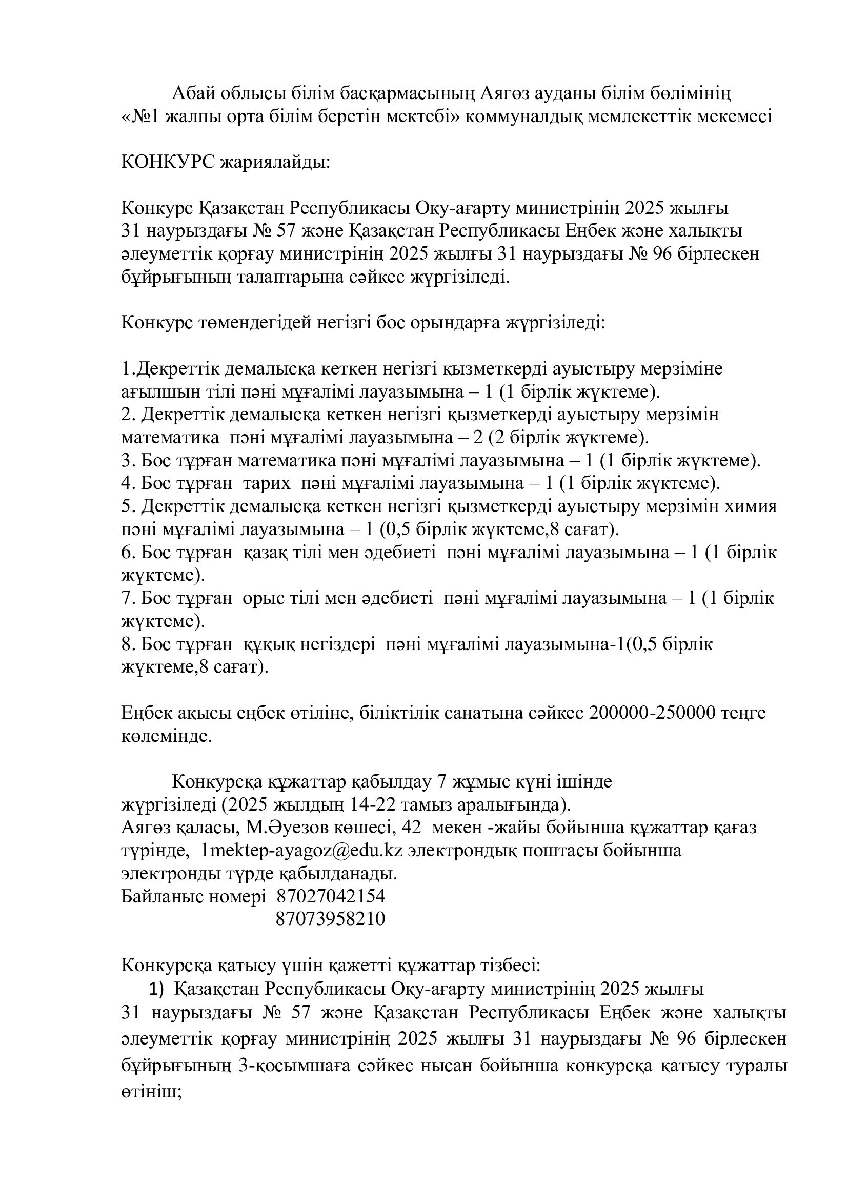 6. Бос тұрған қазақ тілі мен әдебиеті пәні мұғалімі лауазымына – 1 (1 бірлік жүктеме).