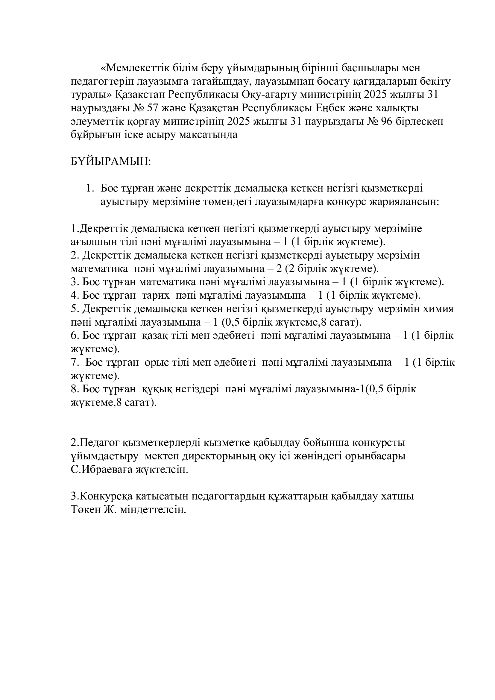 Конкурс төмендегідей негізгі бос орындарға жүргізіледі:1. Декреттік демалысқа кеткен негізгі қызметкерді ауыстыру мерзіміне ағылшын тілі пәні мұғалімі лауазымына – 1 (1 бірлік жүктеме).