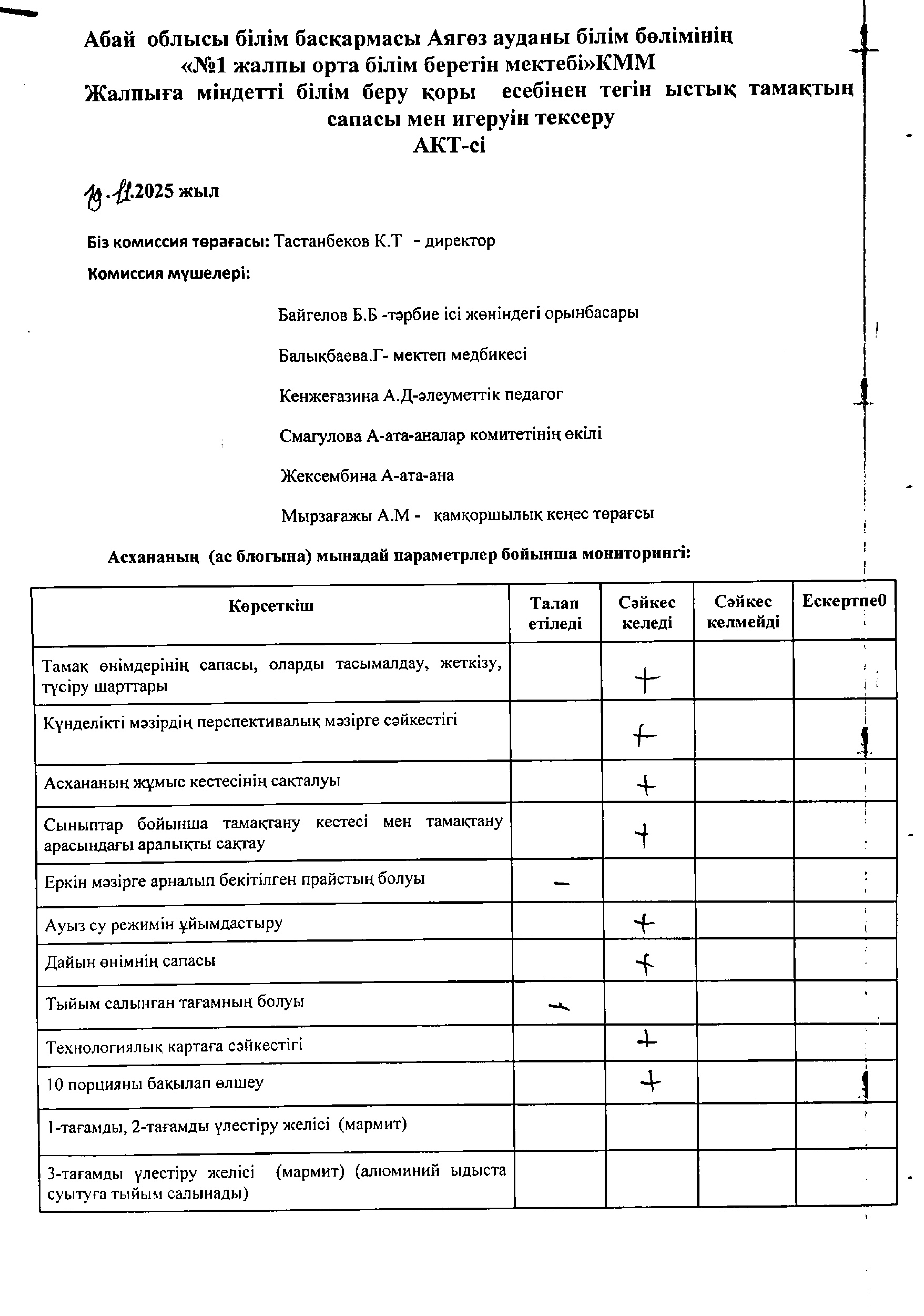 2025 жылдың қараша айының 19 күні Аягөз ауданы білім бөлімі «№1 жалпы орта білім беретін мектебі» КММ-де асханадағы тамақтану сапасын мерзімдік бағалау бойынша бракераж комиссиясы тексеру жүргізді.