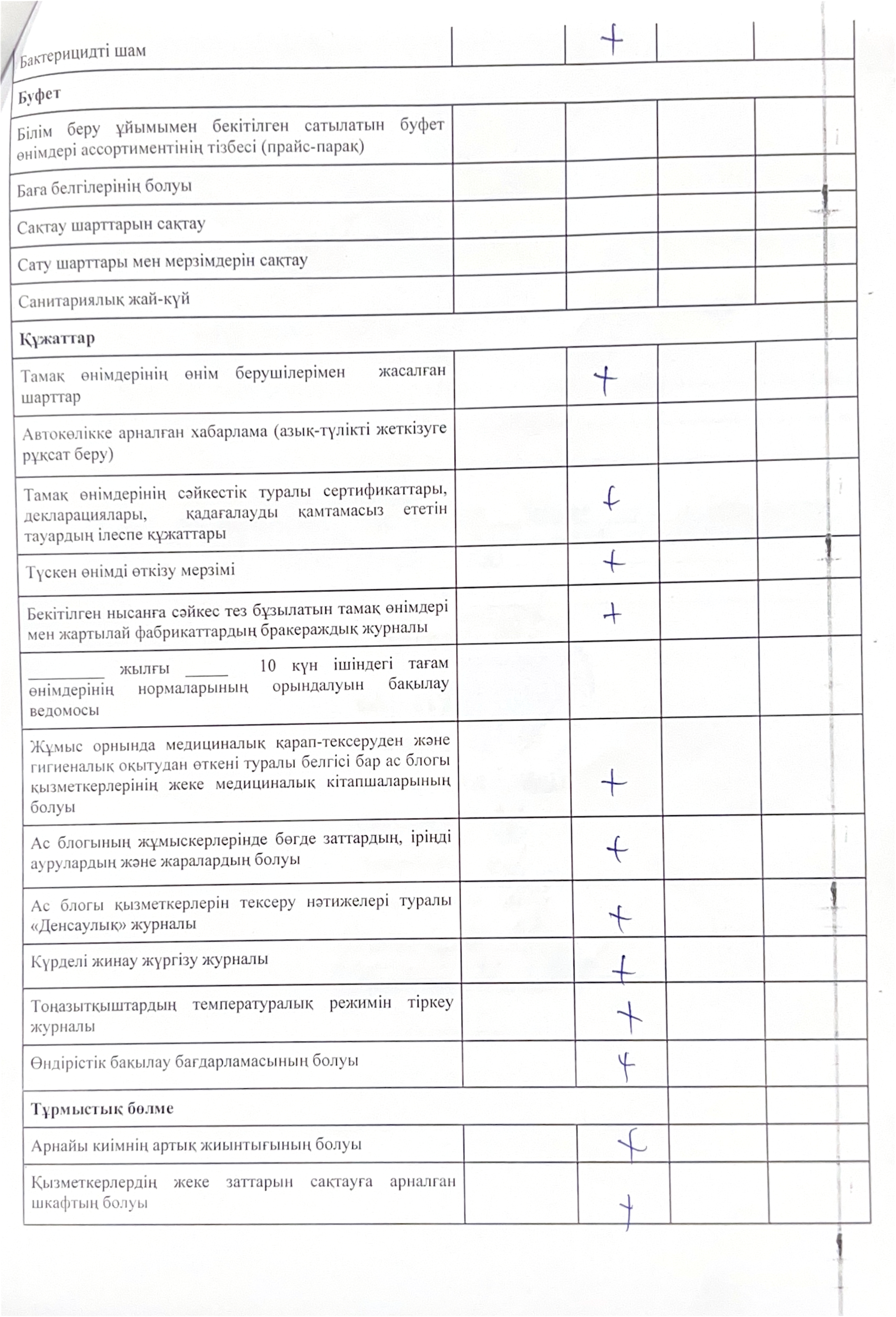 Мектеп асханасының санитарлық жағдайы, асхананың жалпы тазалығы, ыдыс-аяқтардың тазалығы, азық-түлік сақтайтын қоймалар, жеміс-көкөніс сақтайтын орындар, ыдыс-аяқ жуатын бөлмелер, азық-түліктердің сақталуы мен тұтыну мерзімі талапқа сай.