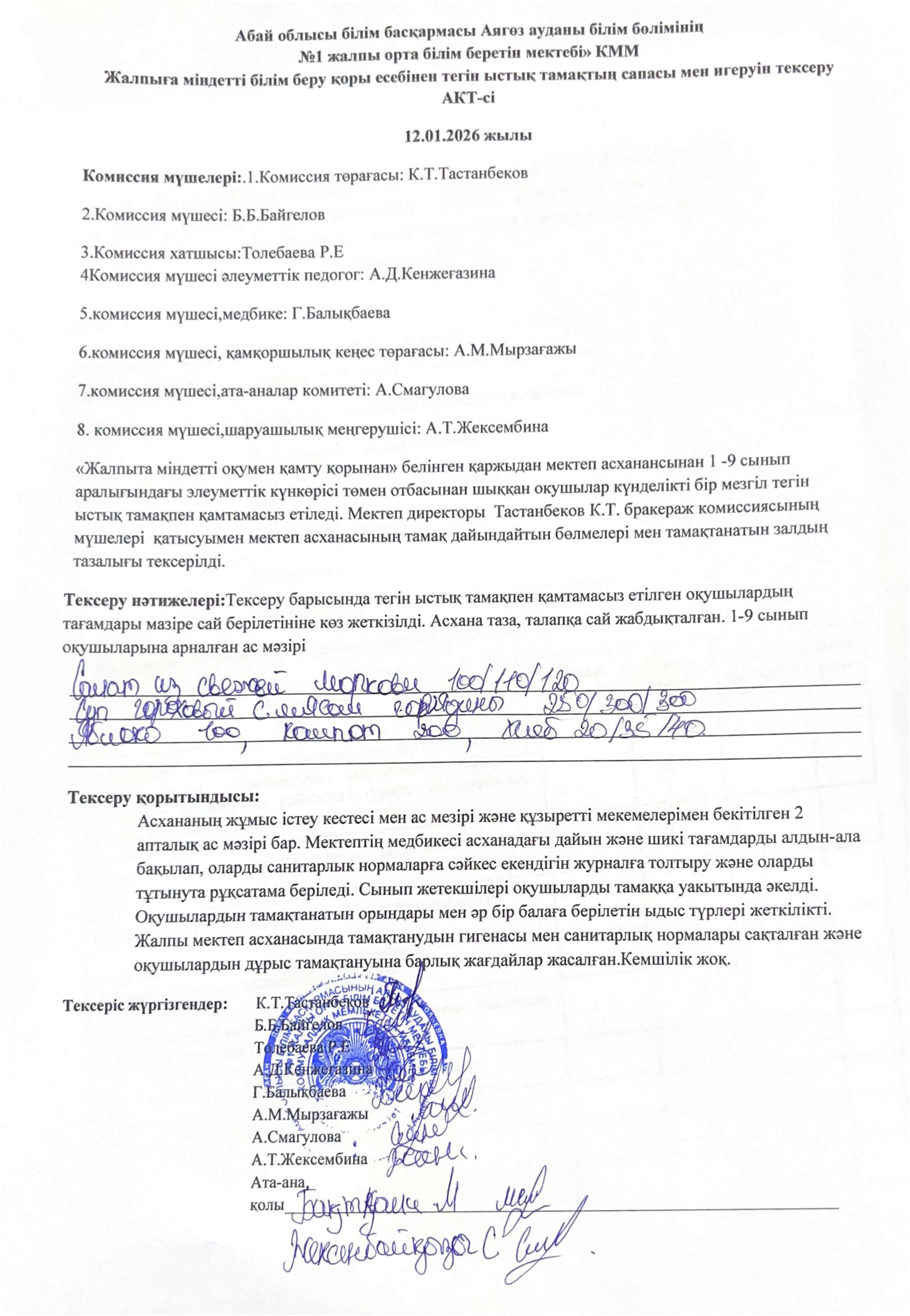2026 жылдың қаңтар айының 12күні Аягөз ауданы білім бөлімі «№1 жалпы орта білім беретін мектебі» КММ-де асханадағы тамақтану сапасын мерзімдік бағалауды жүргізуші бракераж комиссиясы тексеру жүргізді.
