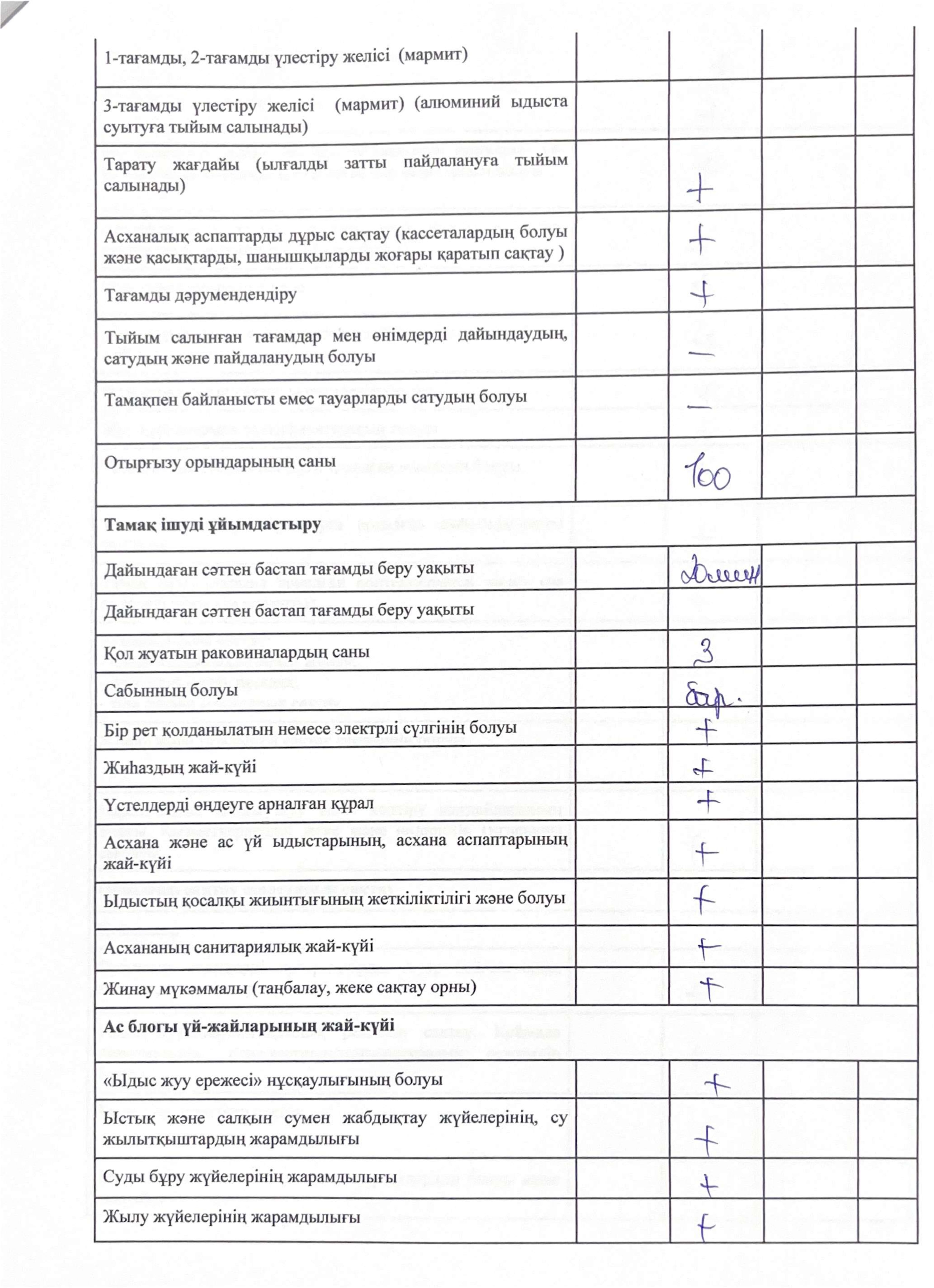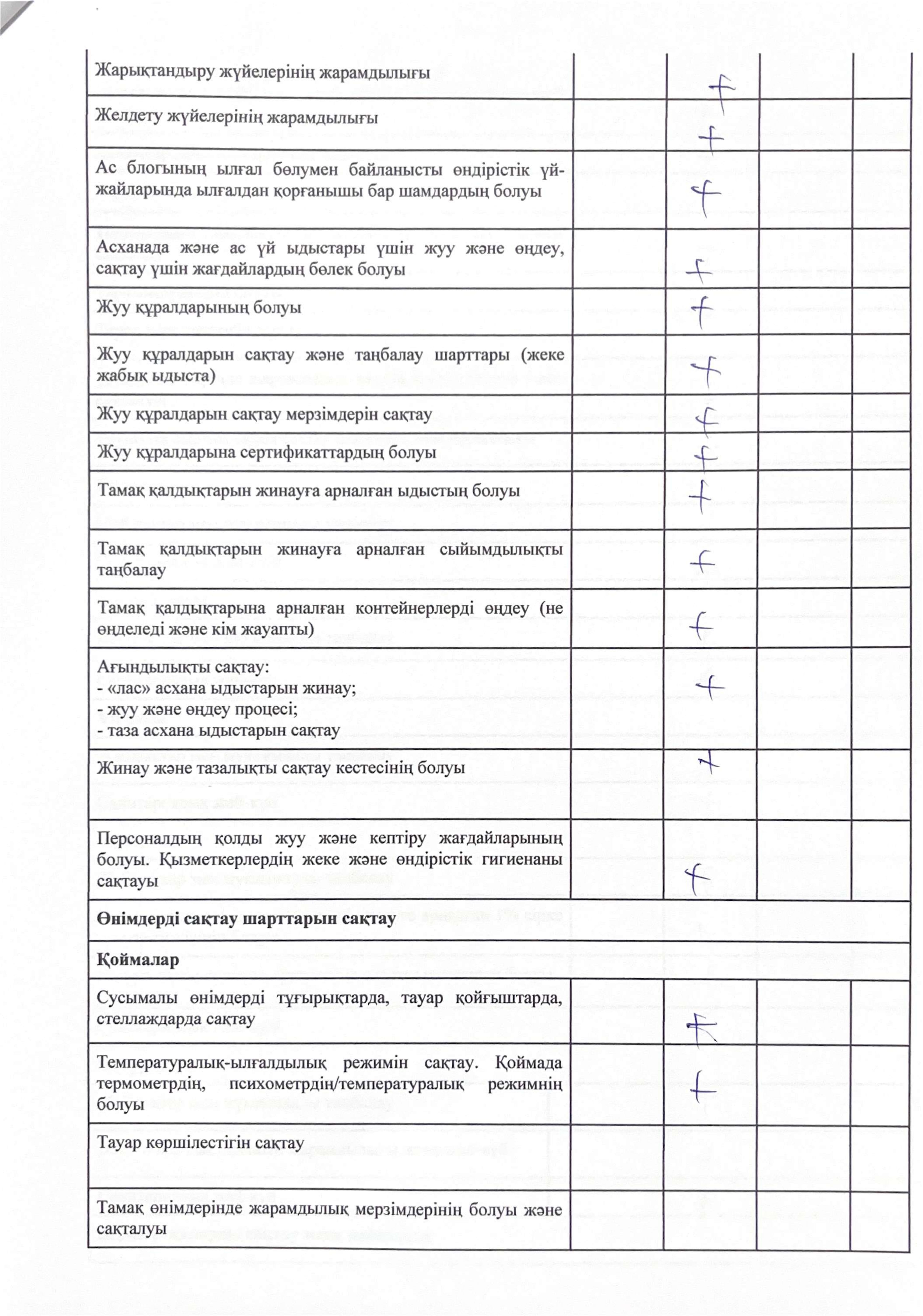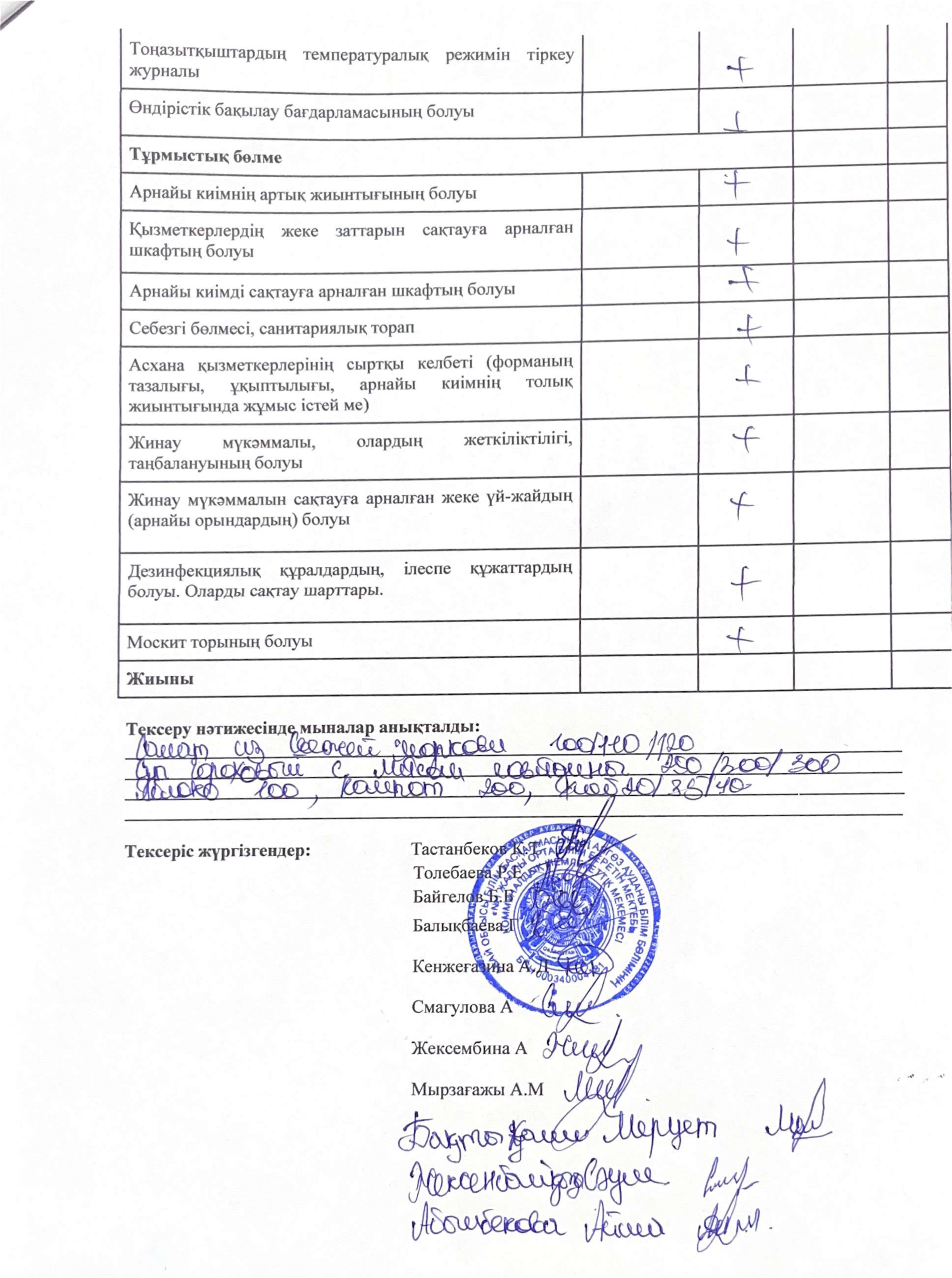Тәуліктік сынама алу мен сақтау қамтамасыз етілген. Аспазшылардың сырт киімдері санитарлық-гигиеналық талапқа сай.