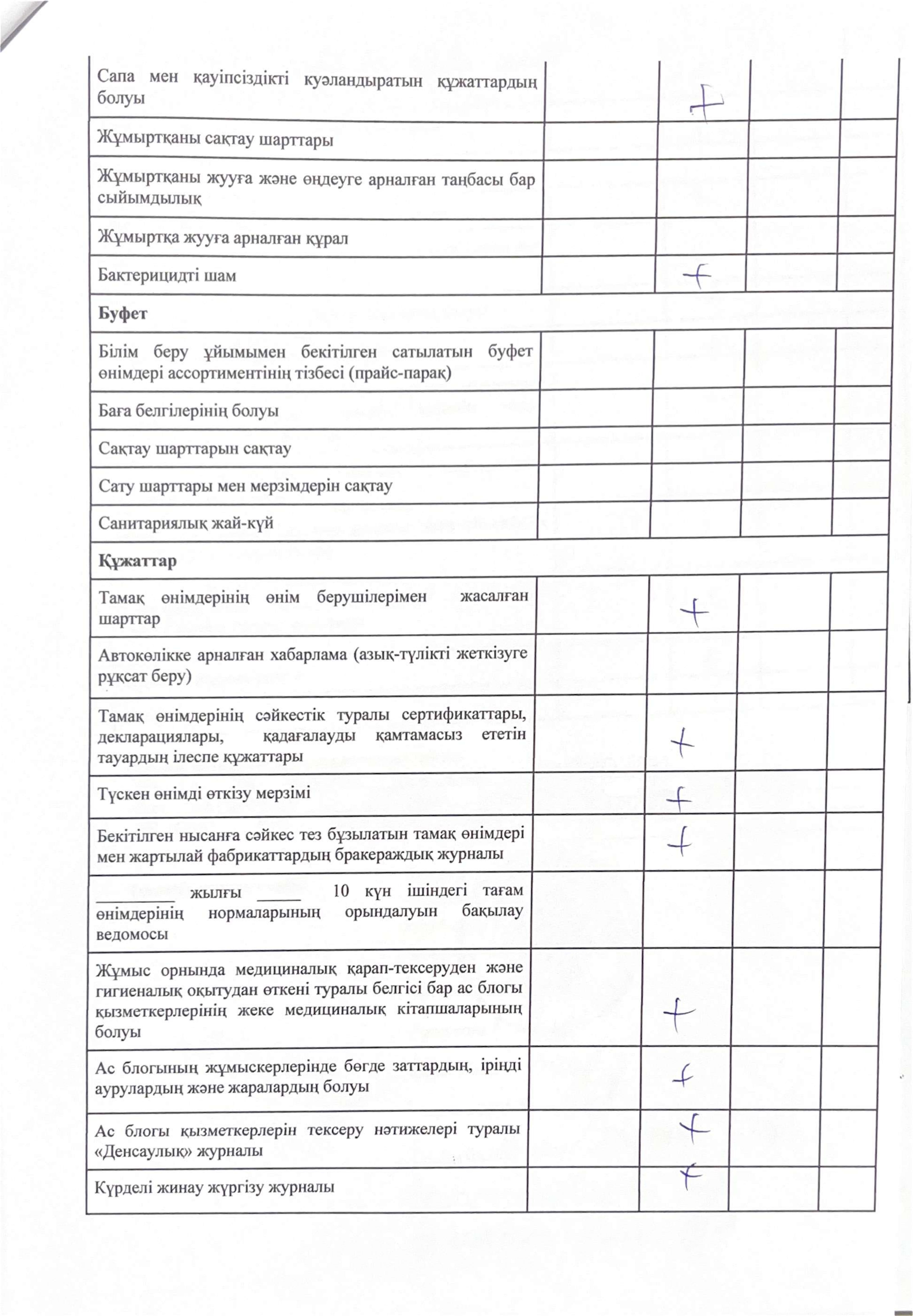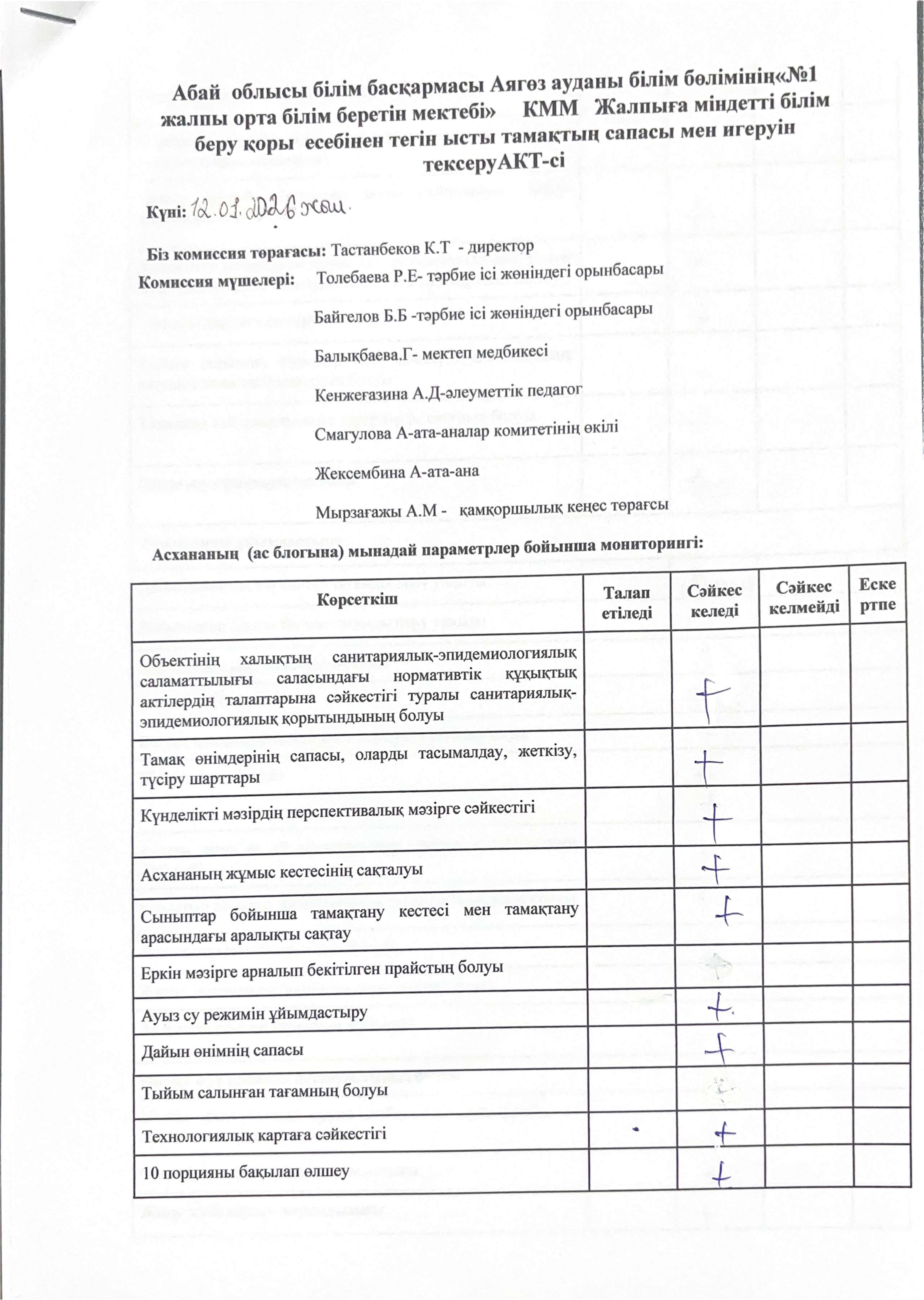 Мектеп асханасының санитарлық жағдайы, асхананың жалпы тазалығы, ыдыс-аяқтардың тазалығы, азық-түлік сақтайтын қоймалар, жеміс-көкөніс сақтайтын орындар, ыдыс-аяқ жуатын бөлмелер, азық-түліктердің сақталуы мен тұтыну мерзімі талапқа сай.